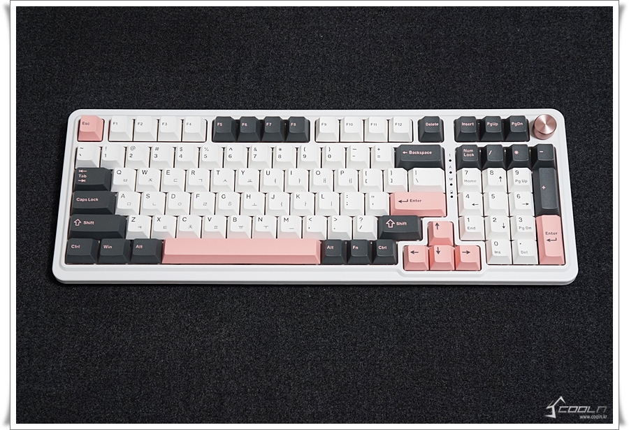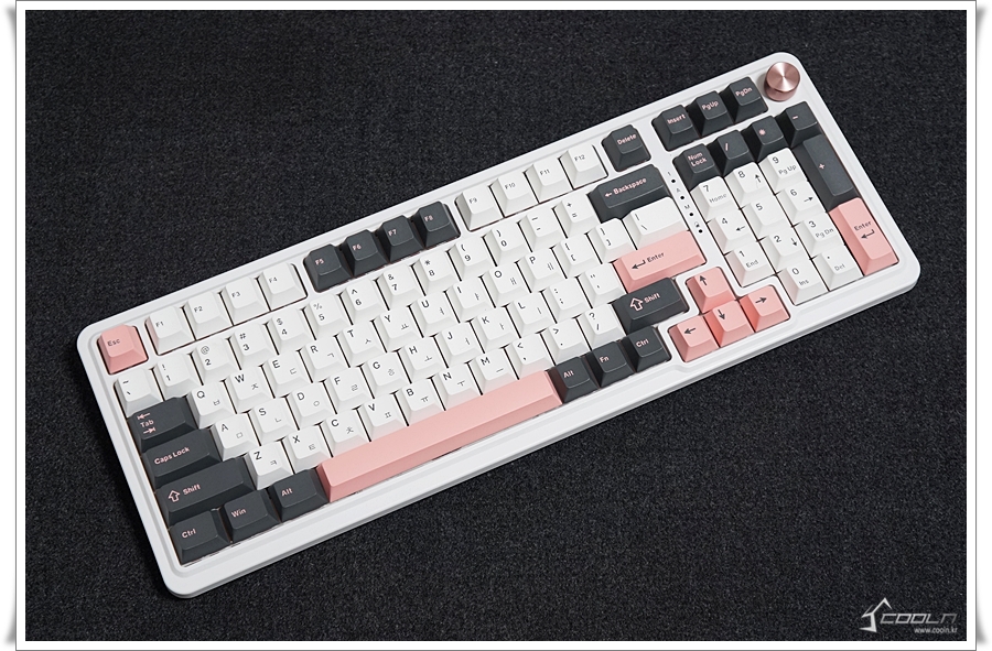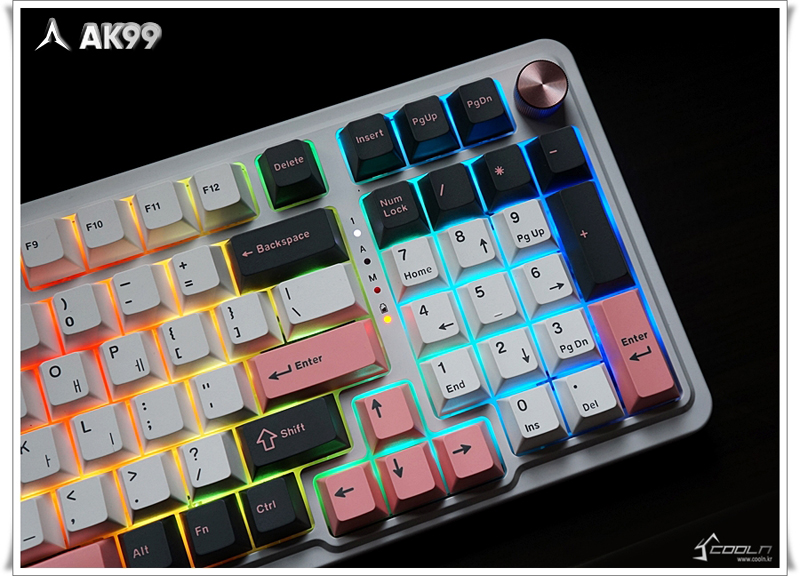 99키 배열로 공간 활용성이 좋으며 이중사출 3컬러 PBT 키캡을 적용해